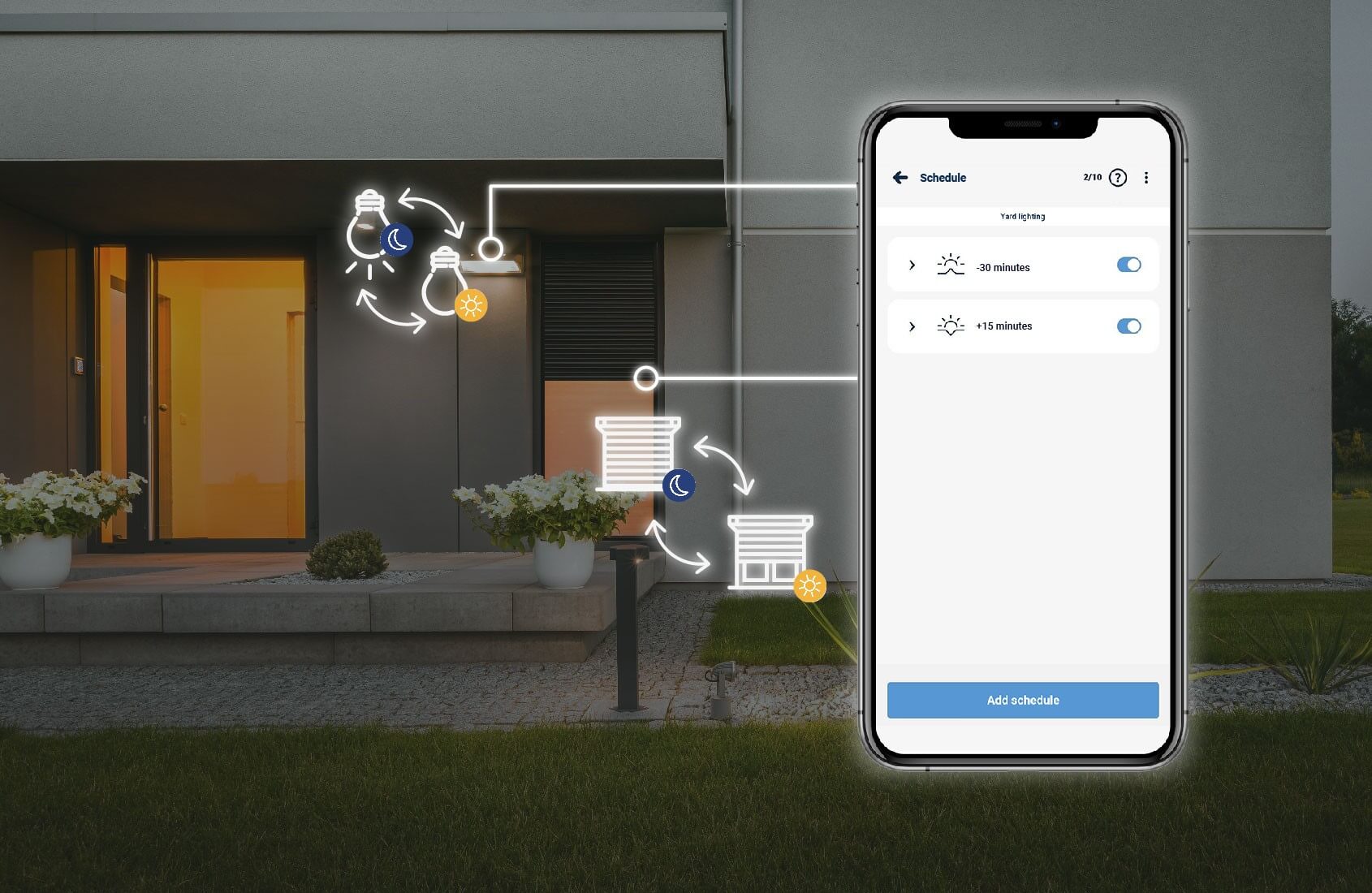 Sterowniki BleBox posiadają wbudowany harmonogram z zegarem astronomicznym (sterowanie o danej godzinie lub o wschodzie i zachodzie słońca).